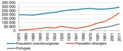 - ↑ «Population totale par nationalité 1875—2001» Архивная копия от 17 октября 2013 на Wayback Machine. Statec .