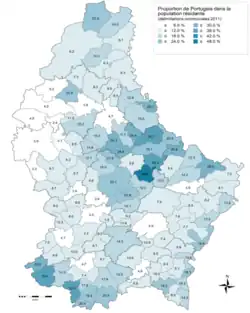 Сбор статистических данных о расе или этнической принадлежности в Люксембурге является незаконным, поэтому трудно правильно оценить количество проживающих в Люксембурге португальцев. Согласно переписи 2001 года в стране проживало 58 657 граждан португальской национальности, что значительно больше, чем в 1960 году[5]. Эти данные могут включать бразильцев и африканцев португальского происхождения.