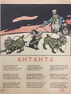 - Третий поход Антанты: Нападение в апреле 1920 года панской Польши (см. Советско-польская война) и белогвардейской армии П. Н. Врангеля из Крыма (по выражению В. И. Ленина «двух рук международного империализма, пытавшихся задушить Советскую страну») рассматривалось как «третий поход Антанты».[3]