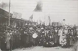![]() Отряд Гоцинского в Темир-Хан-Шуре. Январь 1918. Справа налево: Узун-Хаджи, Нажмудин Гоцинский (отмечен крестом), Сиражудин-Хаджи, Микаил Халилов, Даниял Апашев | |||