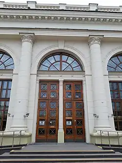 Двухэтажное прямоугольное в плане здание. Имеет симметричную объемно-пространственную композицию. В архитектурном решении фасадов использована ордерная пластика. Угловые части здания с входами на второй этаж выделены пилястрами со стилизованными лепными капителями. Центральная часть фасада с входом в кассовый зал расчленена высокими арочными проемами в обрамлениях с замковым камнем. Межоконные рольставни декорированы полуколоннами с капителями. Фасад венчает антамблемент, карниз с медальонами. По периметру крыши проходит балюстрадный парапет. Интерьеры украшены характерным лепным декором.