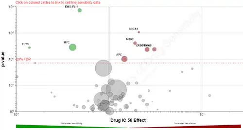 Первый поход — multivariate analysis of variance (MANOVA), разновидность метода ANOVA, используется для определения корреляции между чувствительностью к препарату (по IC50 и наклону кривой доза-эффект) и изменениями в геноме клетки (точечными мутациями, амплификациями или делециями генов и др.). При этом для каждой пары препарат-ген MANOVA определяется характер эффекта и статистическая значимость связи. Данные представляются в виде «Volcano plot». Размер отображаемых кружков соответствует числу событий, взятых для анализа. Наведение на кружок позволяет узнать информацию, касающуюся размера выборки (число клеточных линий), эффект (во сколько раз чувствительность к препарату усиливается или уменьшается) и p-value[15].