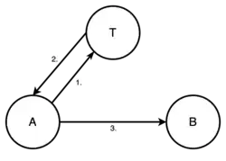 Асимметричный вариант протокола Деннинг — Сакко. Сервер аутентификации владеет открытыми ключами всех клиентов. Рассмотрим реализацию протокола Деннинг — Сакко с открытым ключом[5]: