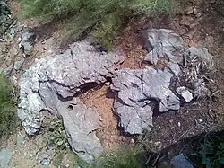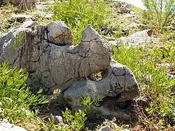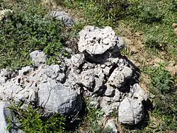 Поверхность плато, прилегающая к юго-западному борту, покрыта каменной россыпью причудливо выветренных форм[4]. Размер обломков — от нескольких сантиметров до двух метров и более. Они сложены серыми и тёмно-серыми известняками, реже — доломитами. При раскалывании обломки издают резкий неприятный запах, похожий на запах сероводорода. Тёмно-серая (почти до чёрной) окраска и резкий неприятный запах обусловлены значительной примесью захороненного в них органического вещества.