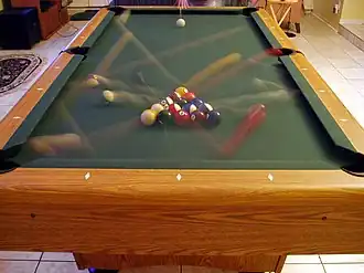 - Игрок забил прицельные шары своей группы и затем отправил в заказанную лузу чёрный шар под номером 8.