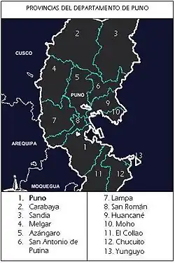 | 1 | Сан-Роман (San Román) | 240 776 | 2 277,63 | 105,7 | Хульяка (Juliaca) (216 716) | ![]() |