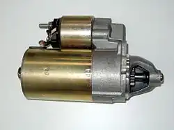 Пусковая контактная группа стартёра (вверху слева, чёрного цвета). Втягивающее реле (соленоид, в центре вверху, малого диаметра, золотистого цвета). В серебристом корпусе — рычажная передача и обгонная муфта. Электродвигатель — большого диаметра, золотистого цвета.