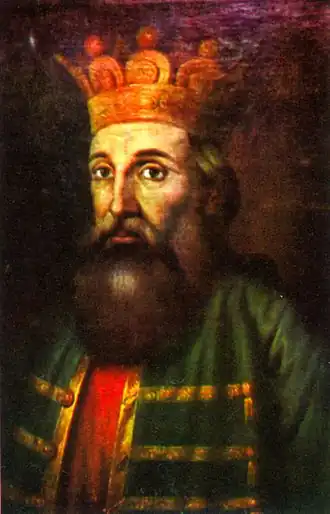 Статуя Петра Второго Мушата на Площади 22-го Декабря в Сучаве, Румыния.Надпись на монументе указывает "Пётр Первый Мушат", как он был знаком историографии до недавнего времени.
