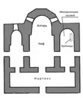 4. Два больших условных типа базиличных построек. Для эллинистического типа характерны: лёгкое стропильное перекрытие, повышенный уровень центрального нефа, многочисленные широкие окна постройки, часто развитая западная часть базилики ― нартекс (иногда экзонартекс), атриум или небольшой портик. Базилики восточного типа: часто имеют сводчатое каменное (или кирпичное) перекрытие, двускатную крышу, узкие и малочисленные окна, центральный неф имеет незначительное возвышение над боковыми, нартекс часто отсутствует. На практике часто встречаются множественные комбинации черт обоих типов[8].