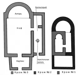 Комплекс состоял из трёх церквей, две из которых раннехристианские (№ 1 и № 2).