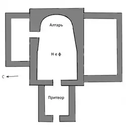 Центр комплекса — октагон, окружён восьмигранным обходом. К четырём граням обхода, ориентированным по сторонам света, примыкают дополнительные одинаковые помещения предпрямоугольной формы с бо́льшей внешней стороной. Церковь не имеет апсиды и наличие четырёх помещений («крестов»), создают крестовидную симметричную в плане форму храма. В центре октагона находится купольная экседра, расположенная на оси восток—запад. Экседра находит подобные аналогии не на Кавказе и в причерноморском ареале, а в памятниках территорий, значительно отдалённых от Причерноморья — в группе церквей Северной Сирии[29].