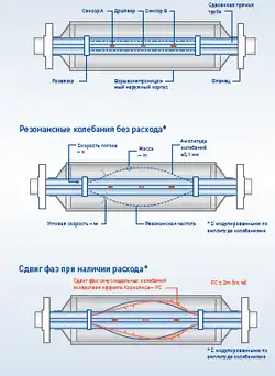 Принцип действия массовых расходомеров основан на эффекте Кориолиса. Массовый расход жидкостей и газов можно рассчитать по деформации измерительной трубы под действием потока. Плотность среды также можно рассчитать по резонансной частоте колебаний вибрирующей трубы. Вычисление силы Кориолиса осуществляется с помощью двух сенсорных катушек. При отсутствии потока оба сенсора регистрируют одинаковый синусоидальный сигнал. При появлении потока сила Кориолиса воздействует на поток частиц среды и деформирует измерительную трубу, что приводит к сдвигу фаз между сигналами сенсоров. Сенсоры измеряют сдвиг фаз синусоидальных колебаний. Этот сдвиг фаз прямо пропорционален массовому расходу.