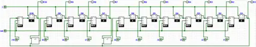 В верхней части схемы расположены выходные контакты, на которых можно увидеть последовательность генерируемых регистром битов. Ниже идут D-триггеры, которые соединены друг с другом и образуют собственно регистр. Самый правый триггер (номер 1) является выходным и, согласно реализуемой конфигурации, влияет на передачу бита из 10-го и 7-го триггеров (берётся XOR передаваемого и выходного бита). Остальные биты передаются без изменений.