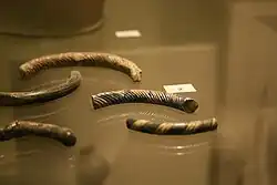 Среди костяных изделий значительную массу составляли художественные поделки: навершия посохов, накладные пластинки на шкатулки и кожаные сумки, различные привески. Навершия изготовляли в виде головок птиц и зверей и в виде разнообразных геометрических фигур. На плоских накладных пластинках изображали фантастических зверей, солнечные знаки, геометрический, растительный, циркульный орнаменты, всевозможные плетёнки и другие мотивы[24].