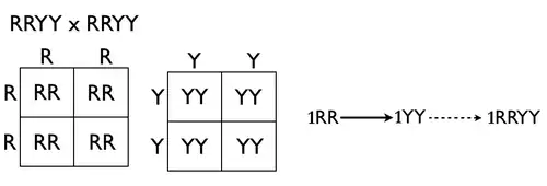 Соотношение в общем количестве получаемых в опыте растений по цвету и форме их плодов (горошин), составляет приблизительно 9 частей с круглыми жёлтыми плодами, приблизительно 3 части с круглыми зелёными, приблизительно 3 части с морщинистыми жёлтыми, приблизительно 1 часть с морщинистыми зелёными плодами. Фенотипы в дигибридном скрещивании сочетаются в соотношении 9:3:3:1.
