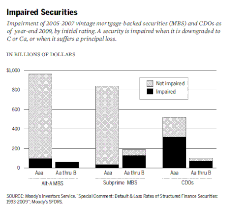 К концу 2009 года более половины обеспеченных долговых обязательств по стоимости,[29] выпущенных в конце ипотечного пузыря (в 2005—2007 годах), которым рейтинговые агентства присвоили наивысший кредитный рейтинг, были подвергнуты процедуре «пересмотра» (англ. impaired), то есть получили «мусорный» статус (англ. junk), либо полностью списаны в качестве «убытков» (то есть не только не выплатили проценты, но и не вернули инвесторам основную сумму, которую они вложили).[30][31][32][33][34] По оценкам Комиссии по расследованию финансового кризиса (англ. Financial Crisis Inquiry Commission), к апрелю 2010 года из всех ипотечных ценных бумаг, которым в 2006 году агентство Moody’s присвоило наивысший кредитный рейтинг 73 % были понижены до «мусорного» уровня.[35]