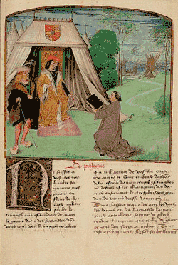 Жан Молине предлагает свою книгу Филиппу Клевскому. Миниатюра из рукописи прозаической версии «Романа о Розе»