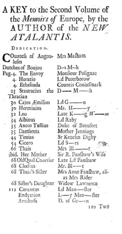 Романы с ключом (фр. roman à clef) — светские романы, получившие распространение в Испании XVI века и Франции XVII века, в которых за условными историческими или мифологическими персонажами угадывались современные придворные[1]. Зачастую к такому роману прилагался «ключ» — список, где указывалось, кто из придворных зашифрован в качестве того или иного персонажа.