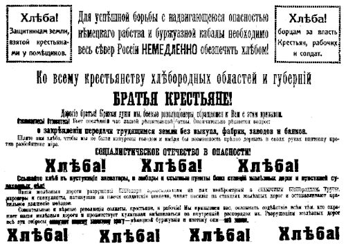 Продовольственное положение внутри страны становилось критическим. Экстремальные условия, сложившиеся в стране в конце весны 1918 года, заставили большевиков прибегнуть к чрезвычайным мерам получения хлеба. 13 мая 1918 года декретом ВЦИК и СНК «О предоставлении народному комиссару продовольствия чрезвычайных полномочий по борьбе с деревенской буржуазией, укрывающей хлебные запасы и спекулирующей ими», были установлены основные положения продовольственной диктатуры. Цель продовольственной диктатуры заключалась в централизованной заготовке и распределении продовольствия, подавлении сопротивления кулаков и борьбе с мешочничеством Народный комиссариат продовольствия РСФСР получил неограниченные полномочия при заготовке продуктов питания. В связи с введением продовольственной диктатуры в мае-июне 1918 г. была создана Продовольственно-реквизиционная армия Наркомпрода РСФСР (Продармия), состоящая из вооружённых продотрядов[35].