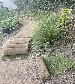 Неразвернутые рулоны травы в частном плодовом саду, Калифорния.