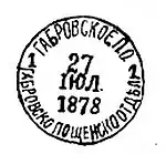 Почтовые штемпели и письма этого времени встречаются очень редко. Хорошо известны штемпели «Свиштовская п. к.» (п. к. — почтовая контора), «Тырновская п. к.», «Габровское п. о.» (п. о. — почтовое отделение). Со второй половины 1878 года стали употребляться и другие штемпели. Их рисунок — два круга с названием населённого пункта в верхней части на русском языке, а в нижней — на болгарском. Употреблялись также штемпели с названием города только на одном языке (сверху) и почтовой эмблемой (два рожка) или небольшим орнаментом (снизу)[4][5].
