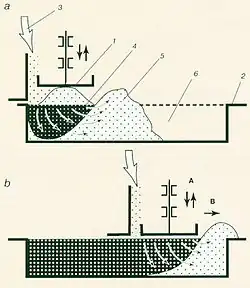 Возникновение текучего клина характеризуется выдавливанием обрабатываемого материала из-под нагнетателя в сторону незаполненной части формы и вверх. После начала такого выдавливания нагнетатель перемещается вслед за выдавливаемым материалом или, наоборот, форма перемещается под нагнетателем. В результате происходит окончательное образование изделия.