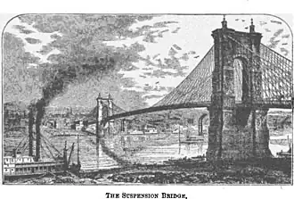 Мост был открыт для пешеходного движения 1 декабря 1866 года, для транспорта 1 января 1867 года. На тот момент это был самый длинный висячий мост в мире, его длина составила 1057 футов (322 м)[109]. Дорожное полотно моста состояло из пары продольных железных двутавровых балок, между которыми в три ряда были уложены дубовые брёвна, покрытые смолой и канифолью. Жёсткость подвесной конструкции обеспечивали фермы из кованого железа между проезжей частью и боковыми пешеходными дорожками, и металлические боковые перила. С помощью 12,5 дюймовых (30,5 см) канатов и подвесок полотно подвешивалось к двум каменным башням высотой 230 футов (70 м); общий вес использованной проволоки достигал 500 ам. тонн (около 453 тонн). Как и в предыдущих проектах, вертикальные тросы — подвески — дополняли косые оттяжки — ванты[110].