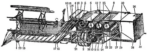 Комбайн СКАГ-5А состоит из крепко связанных между собой хедера и молотилки. При рабочем положении комбайн опирается на два колеса, на прицеп трактора. У комбайна отсутствует мотор, а движение передаётся от трактора СТЗ-ХТЗ. В конструкции хедера использовались механизмы сноповязалки Люберецкого завода, например, режущий аппарат аналогично аппарату сноповязалки состоит из пальцевого бруса, пальцев со вкладышами, прижимных пластинок, пластинок трения и спинки ножа с приклёпанными сегментами. Высота резания прямо во время работы изменяется наклонением комбайна при помощи вращения рукоятки. Также высоту резания можно регулировать механизмом подъёма, который меняет положение полевого и ходового колёс относительно рамы комбайна. Положение мотовила относительно режущего аппарата регулируется посредством двух рычагов. Работа режущего аппарата, мотовила и полотен аналогична работе соответствующих механизмов обычного комбайна Регулировка натяжения обоих полотен осуществляется ремнями. Срезанные и уложенные на большое полотно стебли транспортируются в приёмную камеру 3. В приёмной камере имеется подаватель 4. За барабаном 5 расположены три соломочёса 6, 7 и 8. Значительная часть зерна и мелких частей вороха (до 75 %) проваливается через решётку деки барабана на скатную доску, и оттуда попадает на решето грохота 9. Солома с оставшимся в ней невыделенным зерном последовательно проходит через все три соломочёса. Здесь проходит выделение остальной части зерна из соломы. Зерно и мелкие примеси, проваливаясь через отверстия решёток соломочёсов, также попадают на решето грохота. Последний соломочёс выбрасывает солому в копнитель из молотилки. Скорость лопостей 10 регулируется степенью открытия входных окон с помощью заслонок. Струя воздуха, идущая от вентилятора, препятствует забиванию решета грохота и одновременно выносит из молотилки часть наиболее лёгких примесей. Крупные примеси вороха, не провалившиеся через отверстия решета, выбрасываются из молотилки. Зерно, сорняки и наиболее тяжёлые мелкие примеси, а также часть мякины проваливаются через решето и по скатной доске попадают в шнек 11. Из шнека вся эта масса подаётся элеватором 12 в один из двух мешков, подвешенных к хоботку элеватора. Направление перемещающегося элеватором в ящик продукта регулируется вращающейся заслонкой.