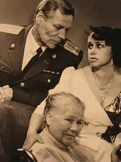 Ю. Оськин в роли Сергея Веткина, Т. Кудрявцева в роли Маши, Н. Мазаева в роли Веры Аркадьевны из спектакля «Дорогой подарок»