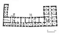Внутреннее пространство спроектировано по коридорной схеме с односторонним расположением помещений. Коридор перекрыт крестовыми сводами.