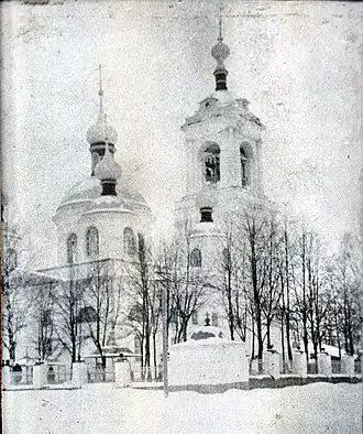 Троицкая церковь построена в 1831—1836 годы на средства купцов Михаила и Прохора Сарычевых в стиле позднего классицизма[2]. Церковь имела три престола: главный — во имя Живоначальной Троицы, в приделах — во имя Архистратига Михаила и благоверных князей Бориса и Глеба. До 1870 года Троицкая церковь была приписной к Покровской церкви. Утварью, ризницей, иконами и богослужебными книгами церковь была снабжена довольно богато. Причт в Покрове состоял сначала из 2 священников, диакона и причетников, с 1857 года прибавлены были ещё священник и диакон[3].