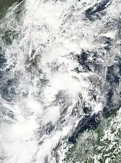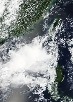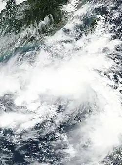 Утром 14 июля JMA отметило переход области низкого давления в Южно-китайском море в состояние тропической депрессии, в связи с началом организации циклона[36] К концу дня JMA начало выдавать бюллетени по системе и спрогнозировало, что депрессия превратится в тропический шторм в течение следующих суток[37].