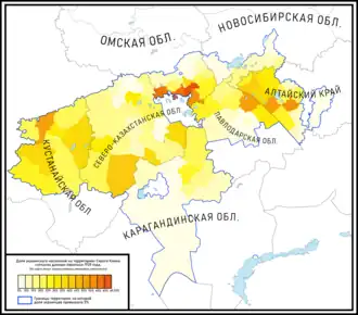 По переписи 1926 в степном краю проживало 1 358 000 украинцев. Выделяют полосу шириной 150—500 км, в которой украинцы составляли большинство. Её площадь 460 тыс. км², в том числе 405 тыс. км² в Казахстане и 5,5 тыс. км² в Сибири. Она простиралась почти на 2 000 км от Оренбурга на Западе до Семипалатинска в предгорье Алтайских гор на Востоке. На этой территории украинцы составляли большинство в 44 районах из 81. Всего в 1926 году их было здесь 915 тыс. чел., что составляло 40,4 % всего населения, в то время как казахов насчитывалось 27 %, а русских 22 %[9].