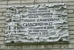 Улица имени первого комсомольского вожака города Ивана Даниловича Сидоренко, геройски погибшего за Советскую Родину в 1942 году.