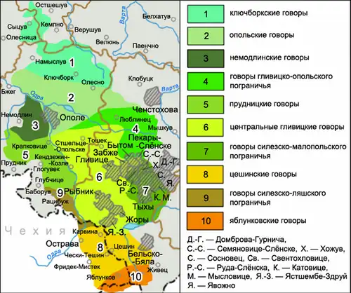 - гливицкие диалекты — центральные говоры, говоры силезско-малопольского пограничья, говоры гливицко-опольского пограничья;