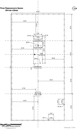 Стены состояли из перпендикулярно поставленных досок, высотой в 10 локтей и шириной в 1,5 локтя, причём боковые (южная и северная) стены имели по 20 досок, а задняя (западная) — шесть, кроме двух особых досок для углов, соединявших её с боковыми стенами. Толщина брусьев досок легко рассчитывается: она составляла 0,5-(1,5/π) = 0,0225 локтя.