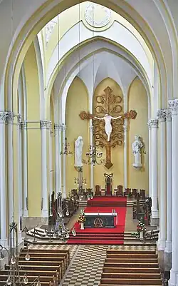 В центральном нефе расположены два сектора скамеек, разделённых проходом. Боковые нефы имеют по пять колонн-контрфорсов, в начале каждого из них установлены исповедальни — конфессионалы. В левой части собора находится часовня Божьего Милосердия, в которой размещены дарохранительница и алтарь Святых Даров. Главный объём храма опирается на десять основных контрфорсов, символизирующих десять заповедей. До 1938 года в боковых нефах собора также стояли скамьи: левая сторона предназначалась для женщин, а правая — для мужчин[17][16].