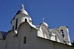 В более толстой западной стене расположена лестница, ведущая на хоры. Восточные столбы здания имеют Т-образное сечение, соединяются с междуапсидными стенками. Западные столбы под куполом в нижней части восьмигранные, а в верхней — прямоугольные. Крайние западные столбы ниже хор круглые, а на верху прямоугольные. Хоры, опиравшиеся на деревянные балки, размещались в западном членении здания. Подкупольное пространство имеет размеры 4,2 м вдоль храма и 3,9 м поперёк. Своды цилиндрические. На наружных стенах имеются плоские лопатки. В северном членении западной стены, где расположена лестница, имеется одна лопатка в интерьере. Лестница внутри храма перекрыта уступами плитами. В алтаре имеется горнее место. Найдены следы алтарной преграды (брус тябла). В здании имеются три аркосольные ниши. Храм венчает три главы — одна большая и две малые. Барабан центральной главы имеет восемь окон, барабаны западных глав — по четыре окна. В верхней части барабанов проходит аркатурный пояс[7]. В XVI веке к западной стороне пристроен притвор (по другим данным — в начале XVIII века[3]), сохранившийся до наших дней. Тогда же над карнизом закомары нартекса южного фасада была надстроена двухпролётная звонница[9].