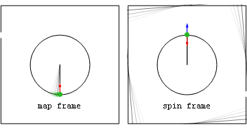 Ускорения и силы в покоящейся (map frame) и вращающейся (spin frame) системах отсчета, связанные с камнем, выпущенным после того, как его раскрутили на невесомой веревке.