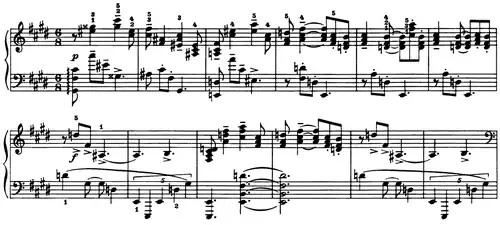 | 6 | 313-329 | В такте 313 отрывок из allegro fantastico завершается кульминацией, основанной на теме meno mosso. Фраза из четырёх тактов звучит три раза, каждый раз на квинту ниже, сначала ре-бемоль мажоре, затем в соль-бемоль мажоре и, наконец, в си-мажоре. Однако ожидаемая финальная кульминация прерывается повторным воспроизведением первой темы на пианиссимо. | ||