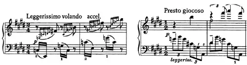 | 3 | 227-270 | В следующем разделе представлены материалы, взятые из вступления и коды. Сначала разрабатывается presto tumultuoso esaltato. Кратко цитируется тема «Трели» (такты 247—250). Затем высмеивается тема languido. | ||