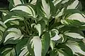 - 'First Frost'. Средних размеров. Мутация 'Halcyon'. Листья сердцевидные, синеватые с желтовато-кремово-белым краем[24][25].