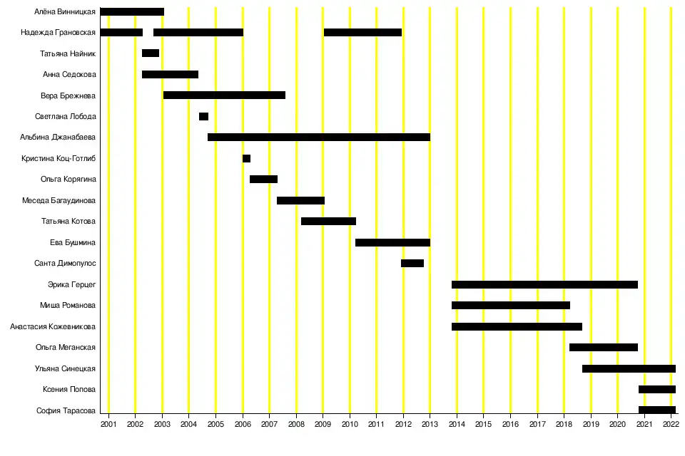 | 12. | Ева Бушмина | 03.2010 — 01.2013 | 2 года 9 месяцев | Эрика Герцег | Набор нового состава |