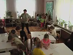 - ↑ О значении работы в малых группах см., напр., Погодина Г. А. О переходе знаний от одного ученика к другому / в кн. Погодина Г. А. «Детский сад или учреждение?»: «Неформальные взаимоотношения при работе в малых группах дают ребёнку возможность сравнить себя с другими, обсудить результаты своих действий, в чём-то помочь своему товарищу, самому увидеть способ как и в чём вовремя поддержать его. В малых группах таятся корни ученических успехов: облегчается работа педагога, это во-первых; во-вторых, дети начинают вести себя иначе, и становясь более покладистыми и сообразительными. Именно в малых группах возникают эмоциональные, по-человечески благоприятные условия для сравнения и оценки как своих знаний, умений и возможностей, так и знаний, умений и возможностей своих товарищей. В такой ситуациях вполне естественным образом происходит скачок в развитии самосознания, за который так ратовал Л. С. Выготский». (Эл. публ. http://setilab.ru/modules/article/view.article.php/view.article.php/c24/295/p61 Архивная копия от 20 мая 2018 на Wayback Machine)