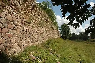 | Ивангородская крепость | Ленинградская область, Ивангород | Заложена в 1492 г.[39], перестроена в середине XVI в. Сейчас архитектурный комплекс XV—XVIII вв. | Сильно повреждена гитлеровцами в 1944 г., однако сохранилась в основных своих частях. | ![]() |