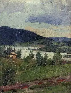 | Пейзаж с озером и лесом англ. Landscape with Lake and Forest, норв. Landskap med vann og skog | ![]() | 1881 | картон, масло | 17 x 14 | 25 | частная коллекция | [15] |