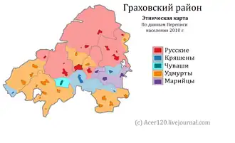| Национальности | русские - 50,6%, удмурты - 31,8%, марийцы - 10,9%, кряшены - 3,6%, чуваши - 1,9% | ||||