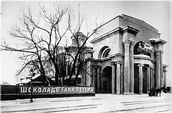 Само здание было построено из несгораемого железобетона с помощью берлинской фирмы «Wayss & Freytag»[3]. Во внутренней отделке не применялось дерево, только цемент, стекло и железо[3]. Данные материалы в начале XX века приобретали всё большею популярность в строительстве. Главным архитектором был Сергей Гингер, а гражданским инженером — Александр Сысоев. Вход с колоннадой, украшенной четырьмя статуями коней, создал архитектор Андрей Белогруд[1].
