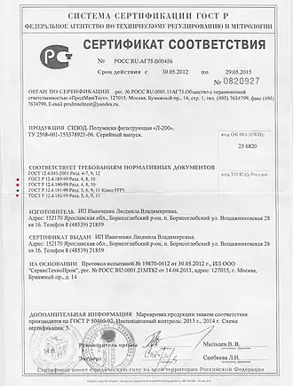 В СССР изготавливалось множество СИЗ[42]. Ассортимент моделей был невелик, иностранные практически не применялись, что приводило к разным последствиям. Например, отсутствие разнообразия моделей противогазных фильтров позволяло экспериментально определить срок службы и указать его в каталоге для всех моделей фильтров, для разных концентраций десятков распространённых газов. Потребитель мог заменять фильтры без использования ненадёжной реакции органов чувств работника на появление вредного газа в маске, во многих случаях. С другой стороны, при несоответствии резиновой полумаски респиратора лицу не по размеру, а по форме — подобрать другую модель было невозможно вообще, так как практически все советские респираторы-полумаски использовали полумаску ПР-7. Качество изделий проверялось на государственных заводах-изготовителях, где были соответствующие подразделения. Отдельных органов по сертификации и отдельных лабораторий не было.