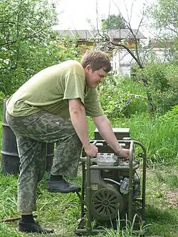 Используется при запуске двигателей небольшой мощности. На лодочных моторах, бензиновых и дизельных электростанциях малой мощности и бензопилах дёргают за тросик, намотанный на маховик или пусковой барабан (так называемый верёвочный стартёр); на мотоциклах используют резкое нажатие ногой на специальный рычаг (кикста́ртер); на мопедах — вращение педалей велосипедного типа; на автомобилях — проворачивают коленвал пусковой (заводной) рукояткой (в среде водителей получившей прозвище «кривой стартёр»). Также существует система пружинного стартера[1], в современных двигателях повсеместно заменённая кикстартерами, но применяется в компрессионных и калильных двигателях для авиамоделей. Мускульная сила всегда доступна и не зависит от заряда аккумуляторов и т. п. Однако такой метод запуска не очень удобен в эксплуатации; чаще он используется в качестве резервного. На современных автомобилях, в подавляющем большинстве случаев, использование «кривого стартёра» вообще не предусматривается. Помимо всего прочего, «кривой стартер» крайне травмоопасен при неправильном использовании.